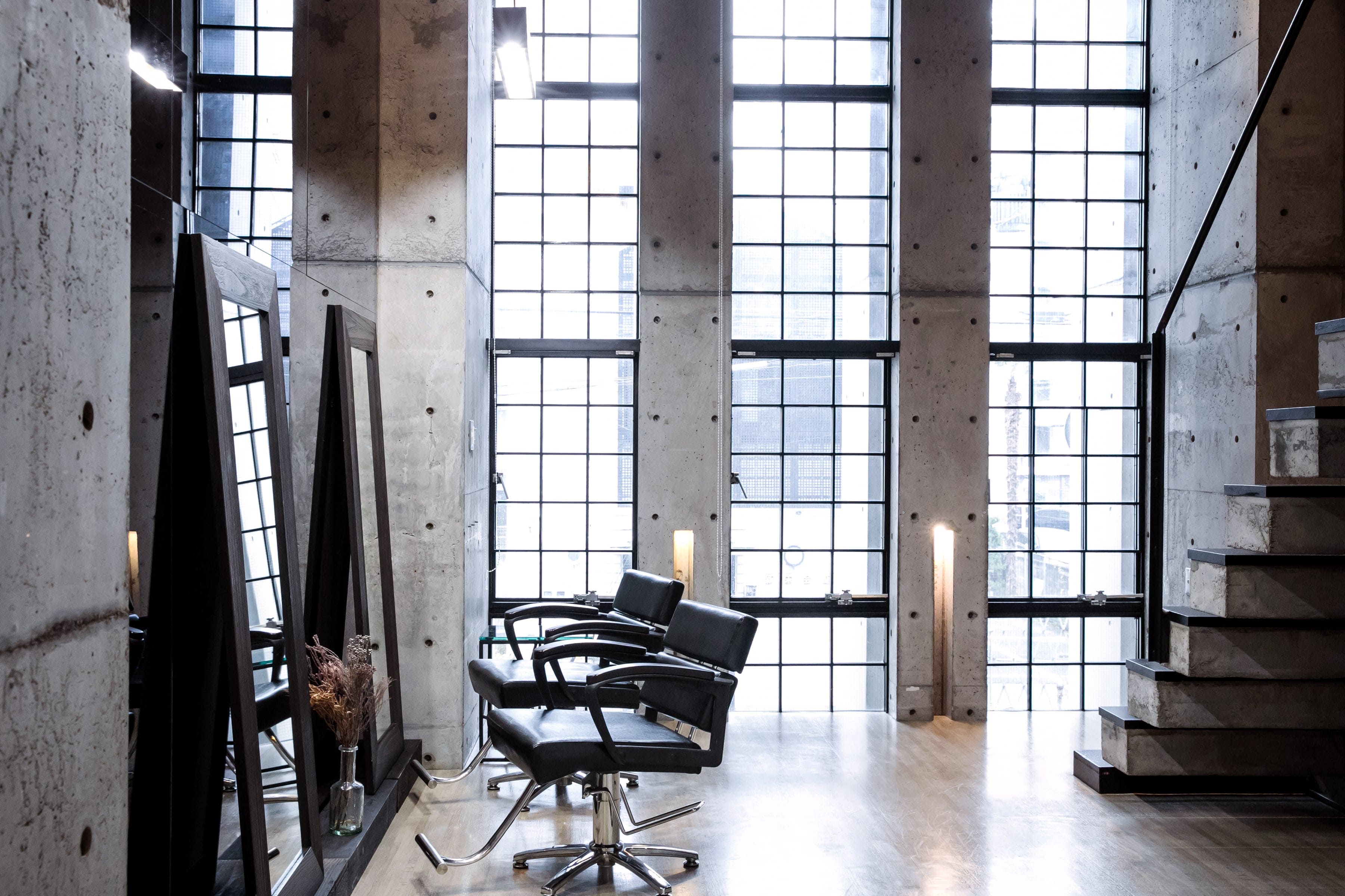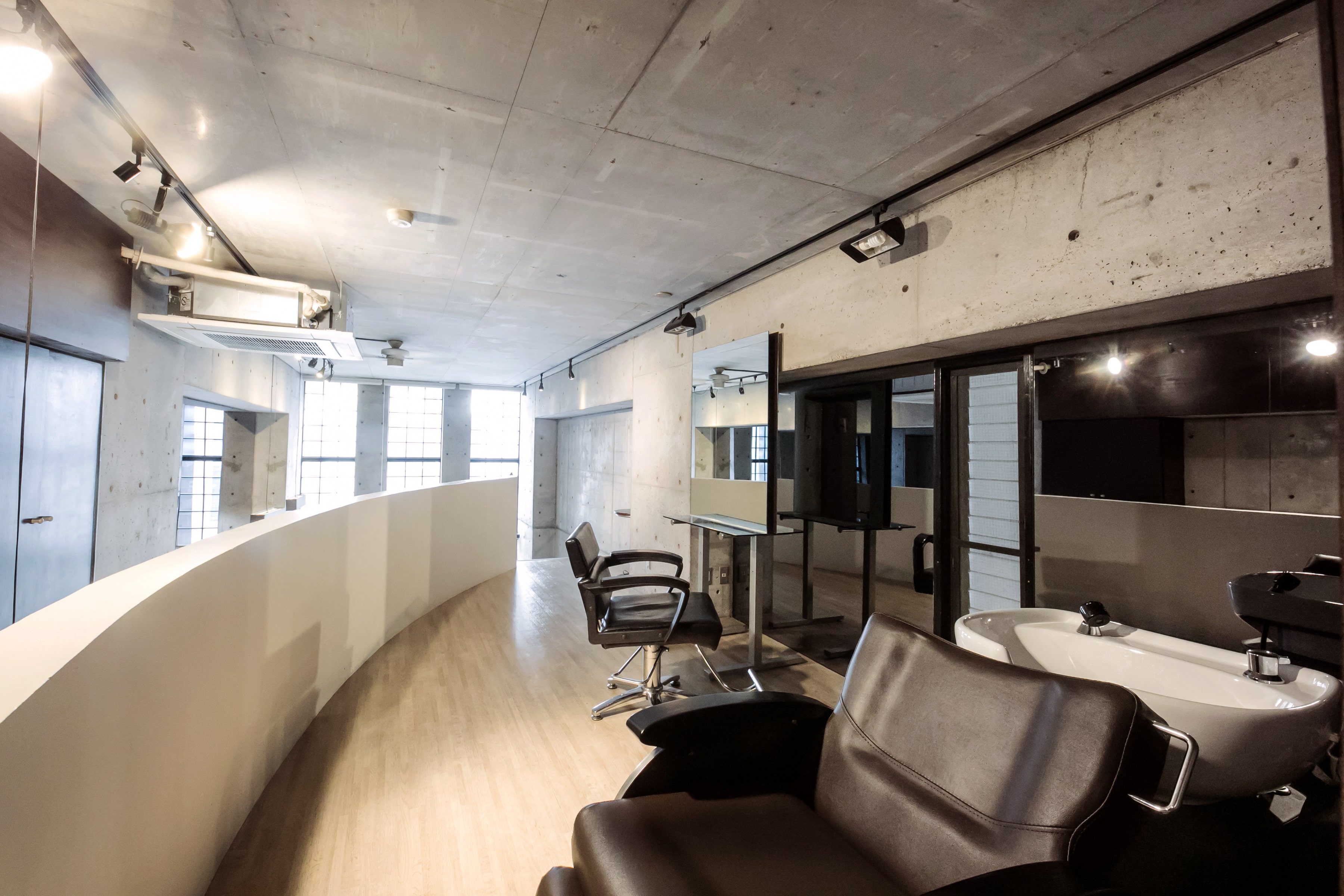 大きな窓が特徴の1階は2席をご用意しています。 窓から差し込む光が気持ちよく、天井も開放感抜群な空間で、心地よい時間をお過ごしください。 外観のスタイリッシュな印象とは裏腹に、一度施術を受ければ、誰もが行きつけのお店のように感じられる、距離の近さやアットホームさが人気の秘訣。